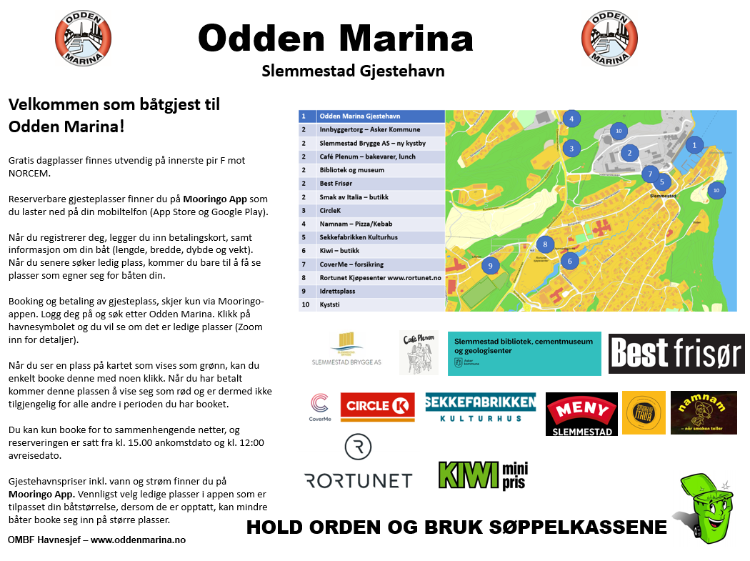 Gjestehavnsligge sammenhengende over 3 dager er ikke tillatt dersom dette ikke er avtalt på forhånd med havnesjef. Odden Marina er en privat båthavn, og det skal tas hensyn til naboene som bor på Odden, og vi ønsker ro i havnen etter kl. 22.00. Båter avvises ved avvik.